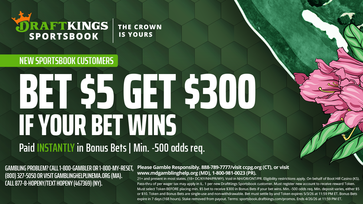 1 per new customer. Get max. $300 in Bonus Bets if your bet wins. Min. -500 odds req. Must select token BEFORE placing min. $5 bet. Token and Bonus Bets are single-use and non-withdrawable. Bonus Bets expire in 7 days (168 hours). Stake removed from payout. Token expires 5/3/2026. $5 bet must settle by 5/3/2026. Terms: sportsbook.draftkings.com/promos. Ends 4/26/26 at 11:59 PM ET.