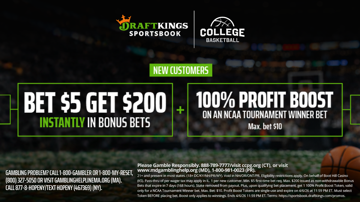 21+ and present in most states. (18+ DC/KY/NH/PR/WY). Void in NH/OR/ONT/PR. Eligibility restrictions apply. On behalf of Boot Hill Casino (KS). Pass-thru of per wager tax may apply in IL. 1 per new customer. Min. $5 first-time bet req. Max. $200 issued as non-withdrawable Bonus Bets that expire in 7 days (168 hours). Stake removed from payout. Plus, upon qualifying bet placement, get 1 100% Profit Boost Token, valid only for a NCAA Tournament Winner bet. Max. Bet: $10. Profit Boost Tokens are single-use and expire on 4/6/26 at 11:59 PM ET. Must select Token BEFORE placing bet. Boost only applies to winnings. Ends 4/6/26 11:59 PM ET. Terms: https://sportsbook.draftkings.com/promos.