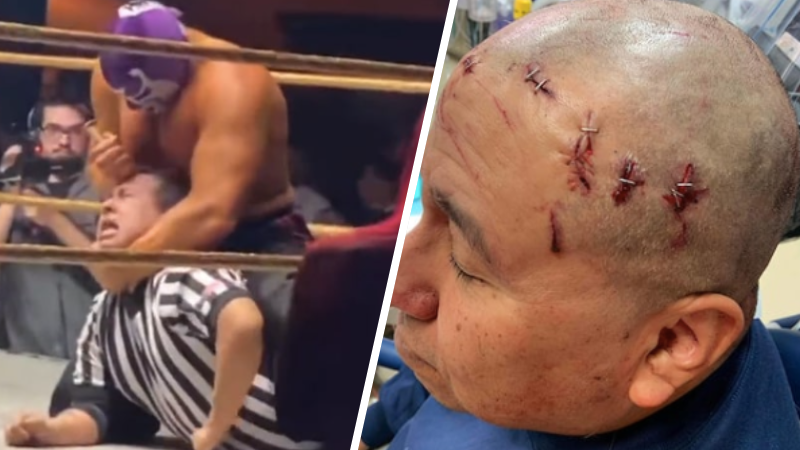 In the video you can see Nicholson took out the spike and began stabbing it into the ref’s head, repeatedly.